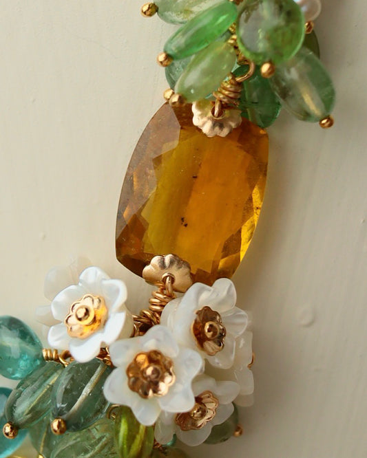 Yellow Tourmaline Rectangle Necklace with Multi-Color Tourmaline and Pearl Flower