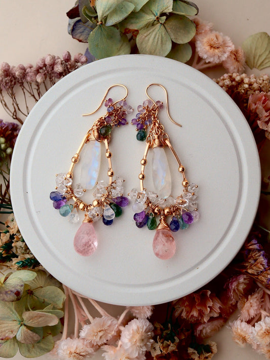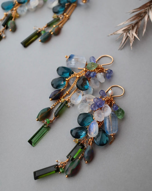 [Portrait in a Ring] Garnet and Green Sapphire Long Earrings