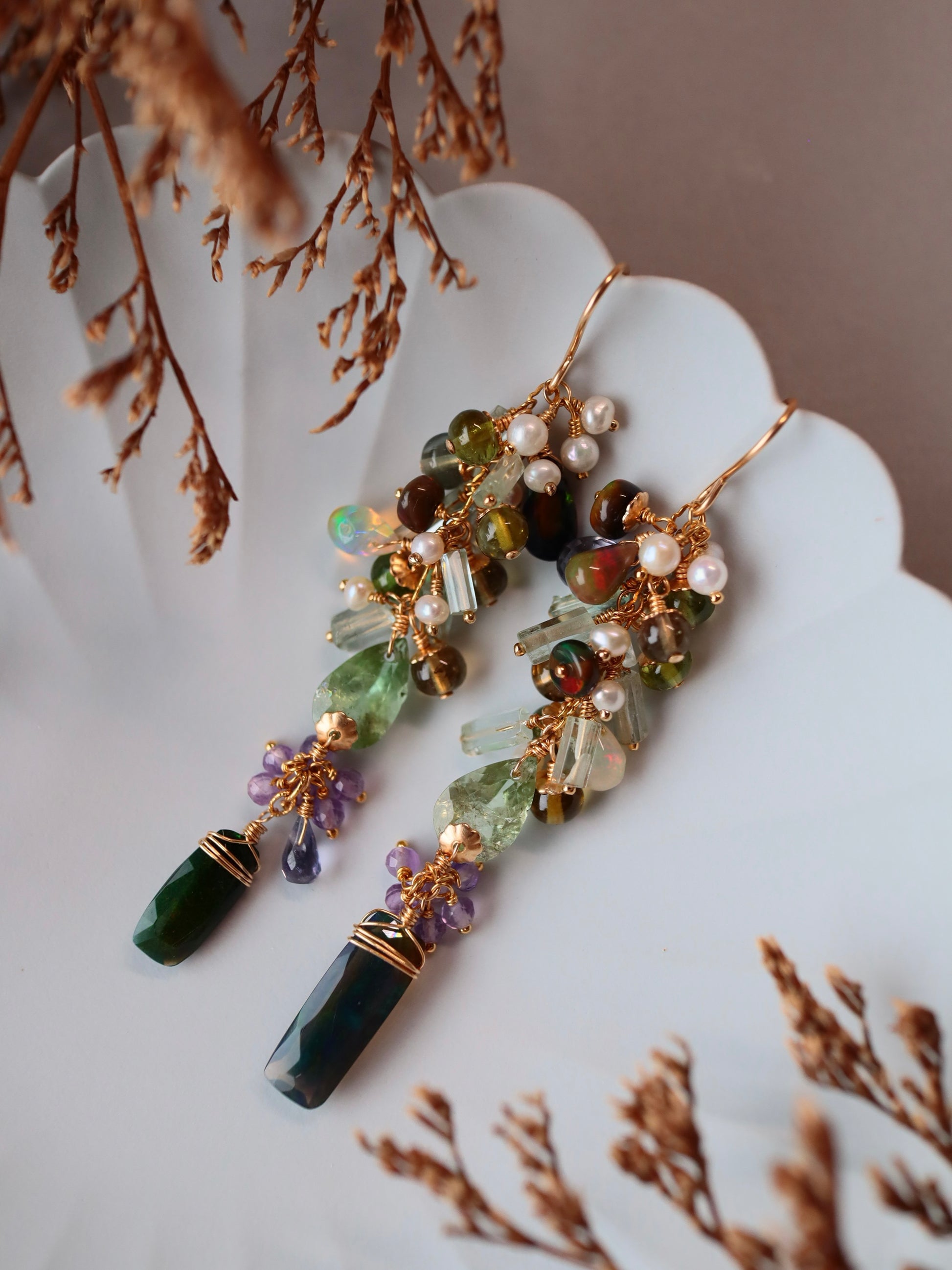 “Autumn Arrives in the Night” — Black Opal & Tourmaline Earrings