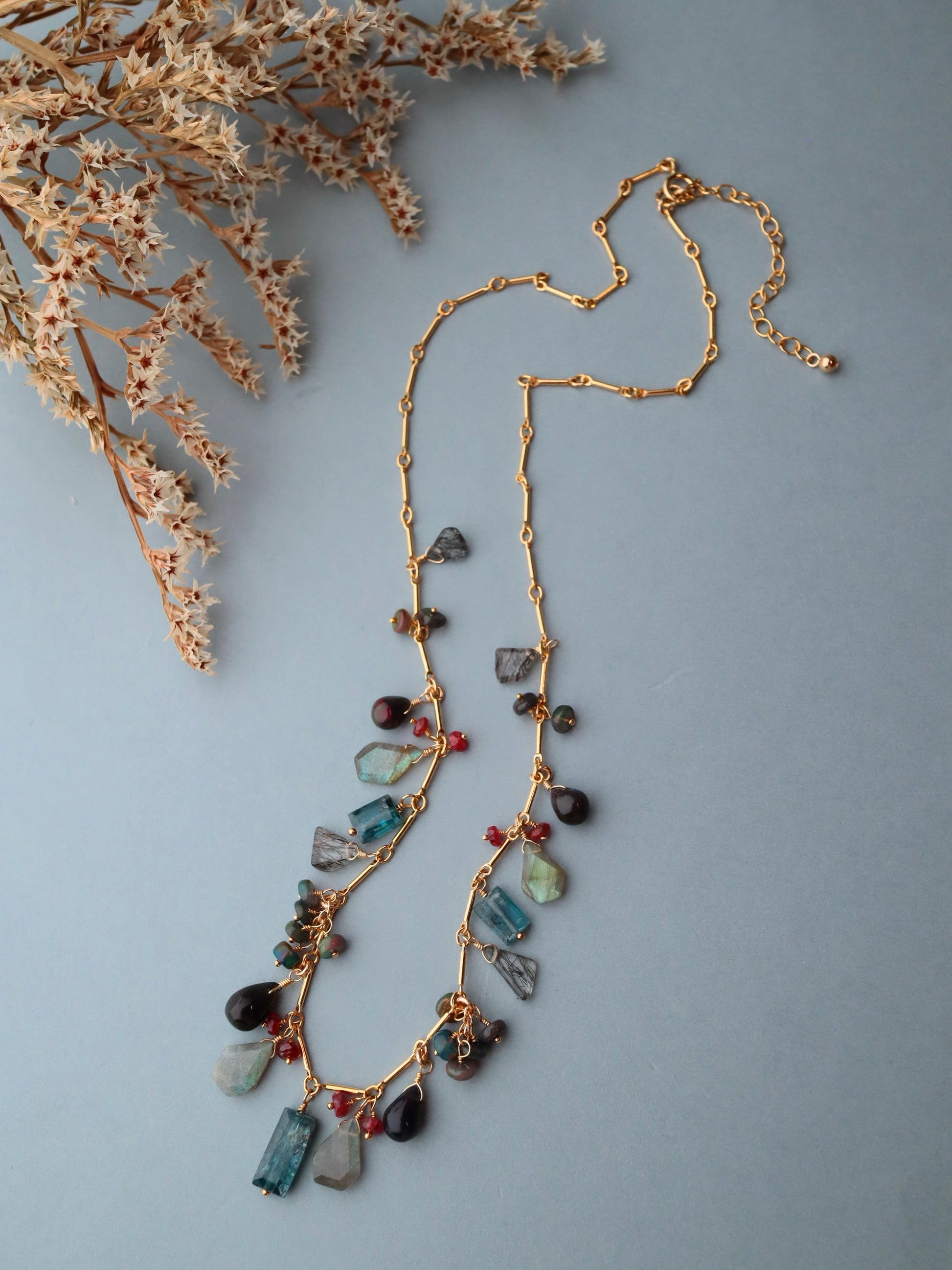 Black opal, deep blue kyanite, labradorite, red spinel, black rutilated quartz