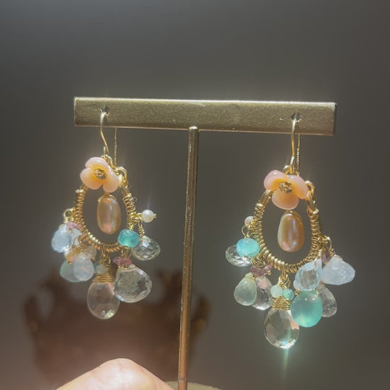 Freshwater pearls (pink and white), green amethyst, aquaprase, pink shell, prehnite, moonstone, sky blue topaz, grandidierite, pink sapphire
