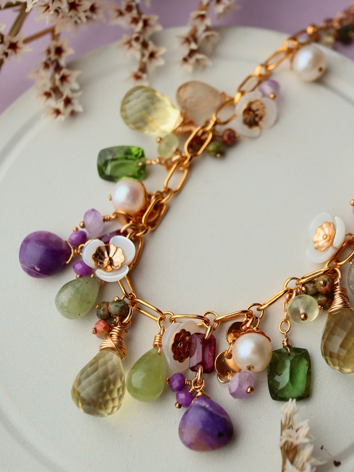 Lemon quartz, green apatite, charoite, freshwater pearl, garnet, sapphire, amethyst, white shell, etc.