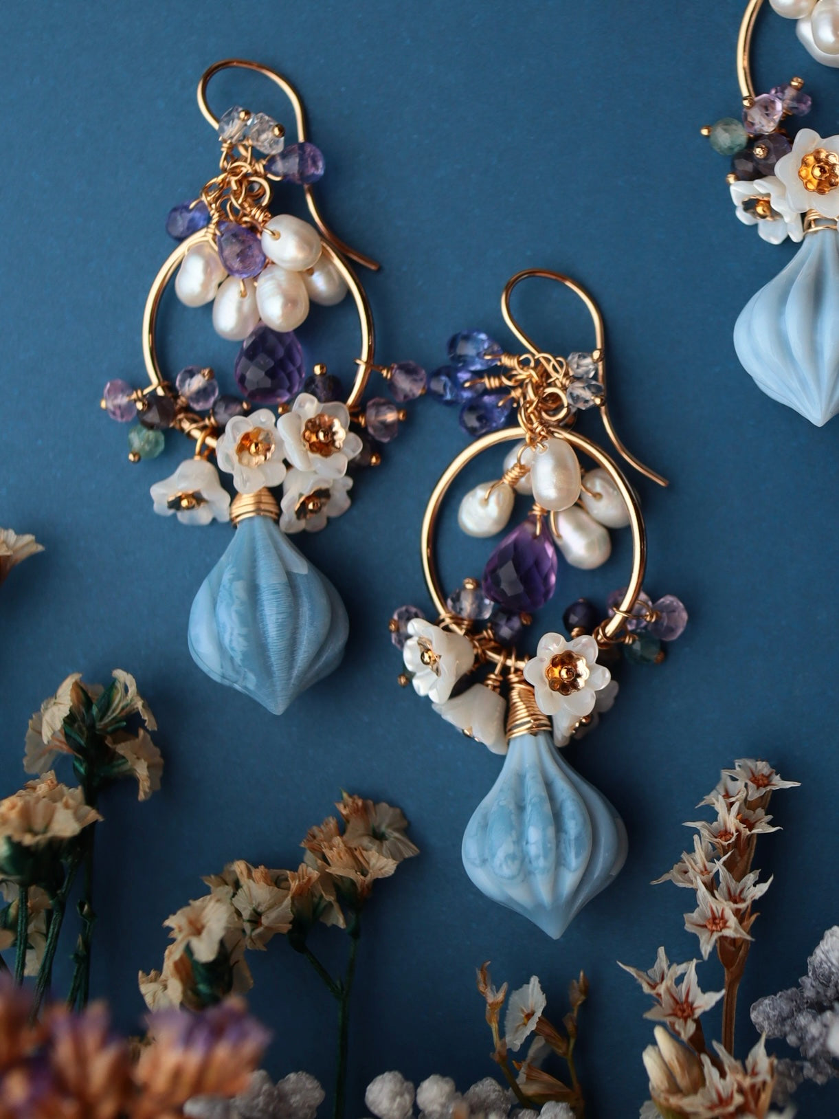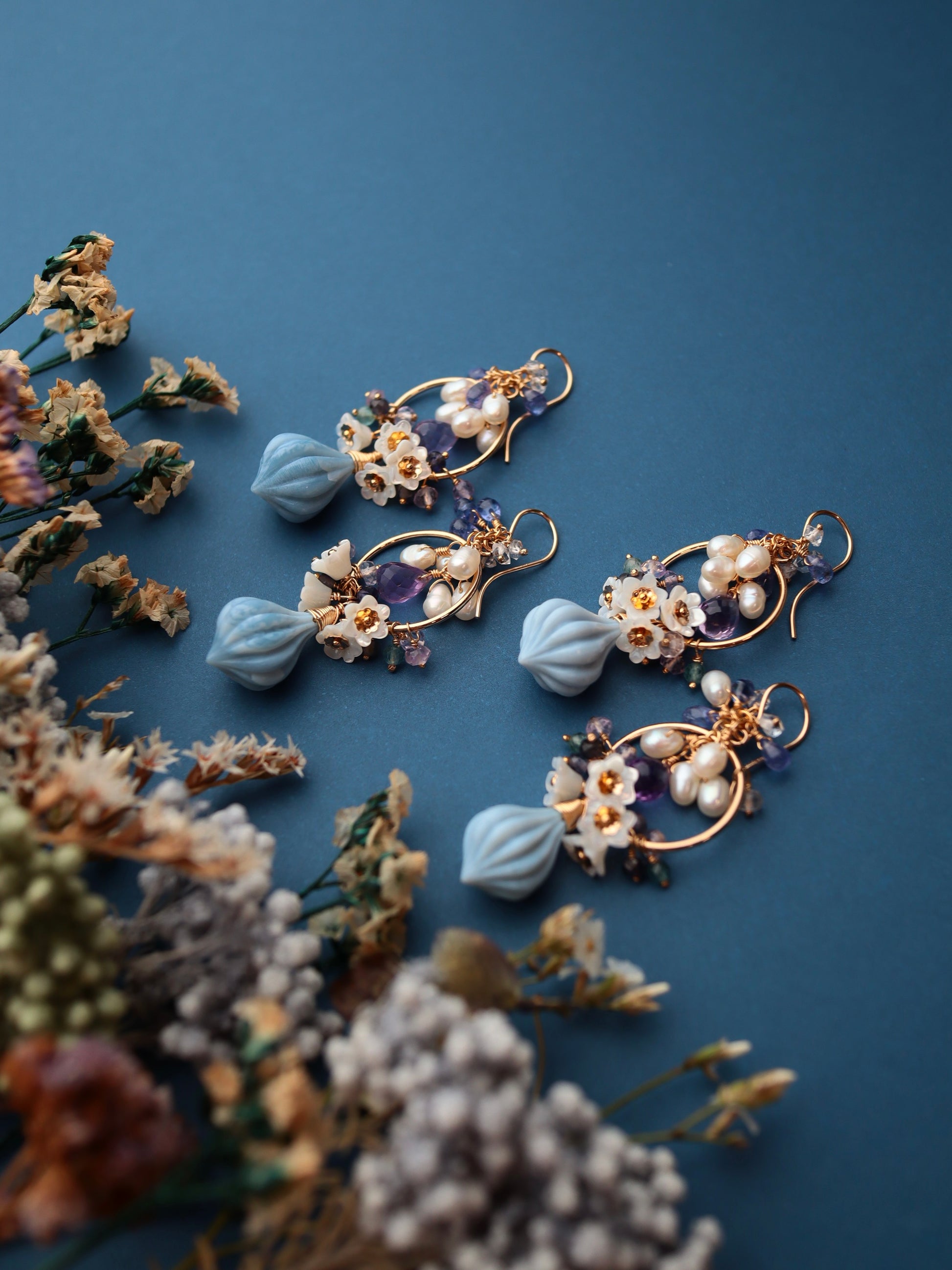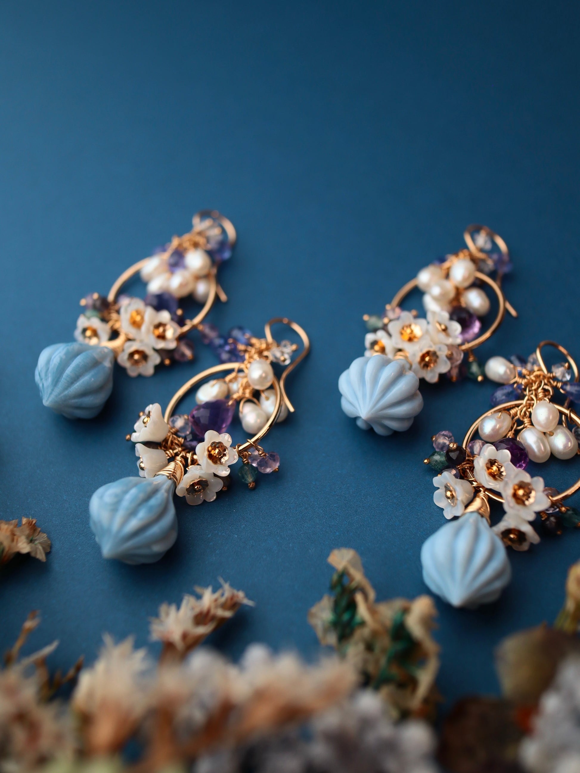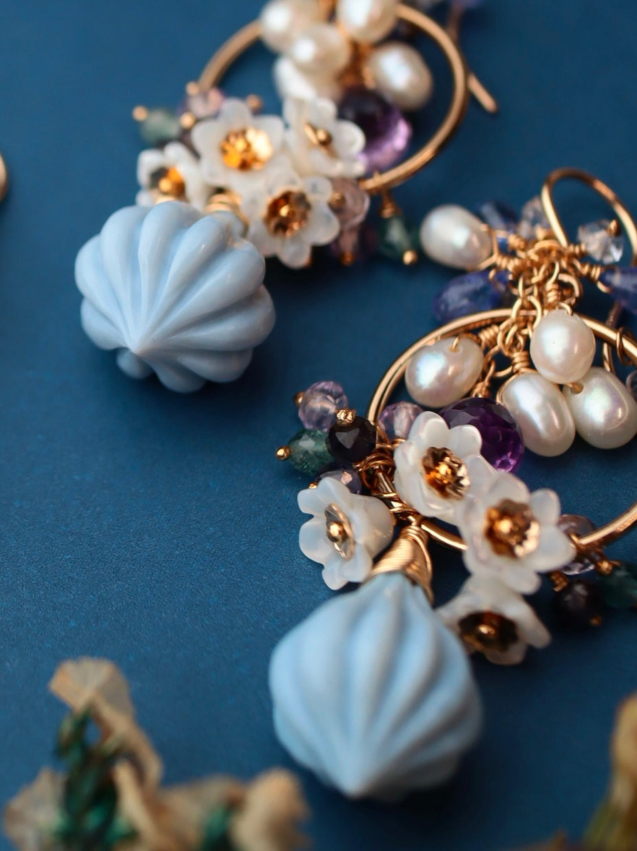 Blue opal, white shell, amethyst, tanzanite, double point quartz, iolite, green tourmaline