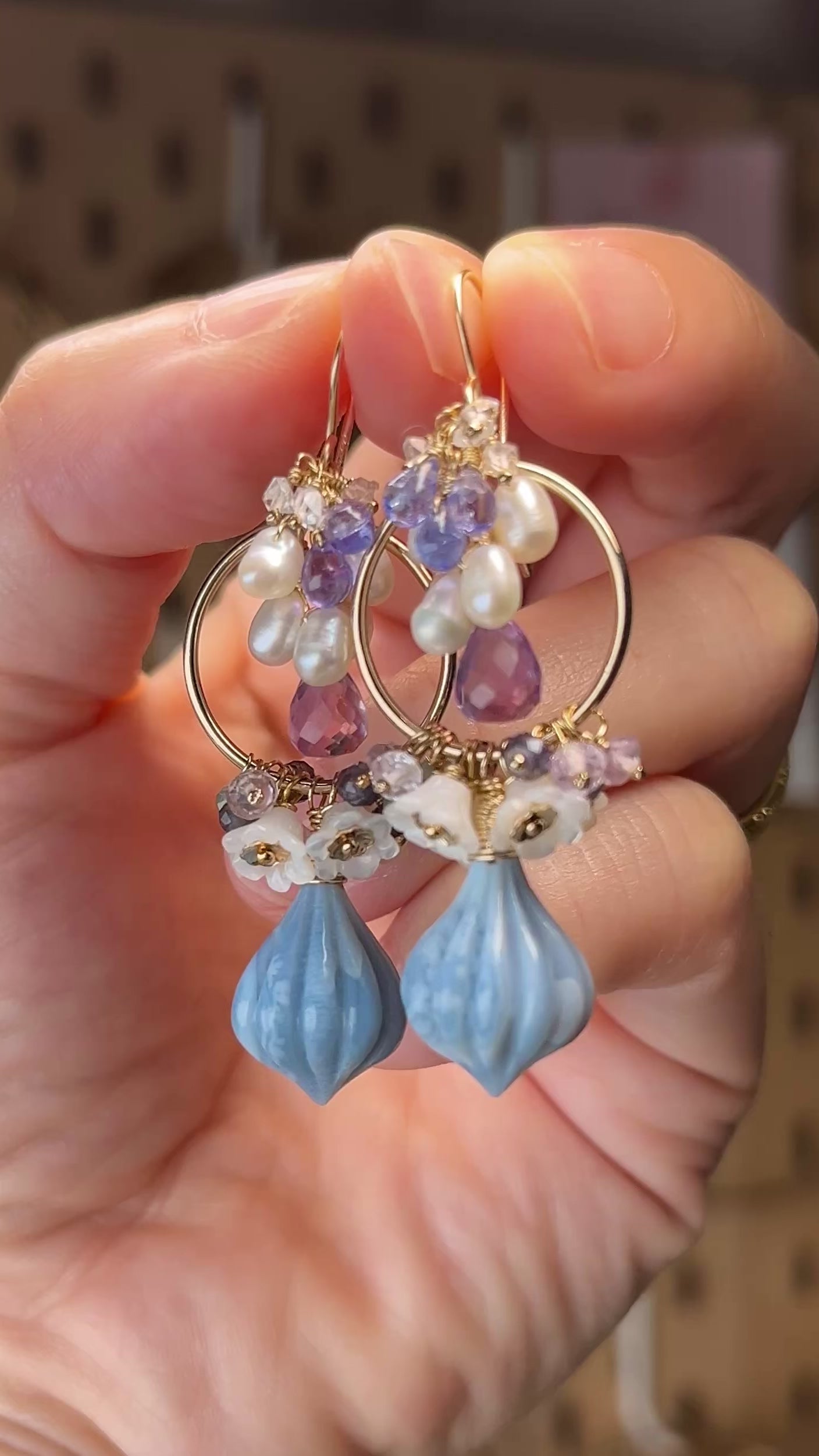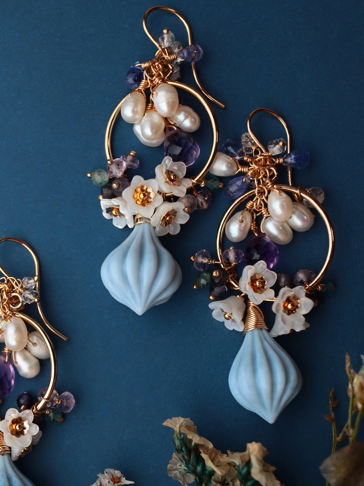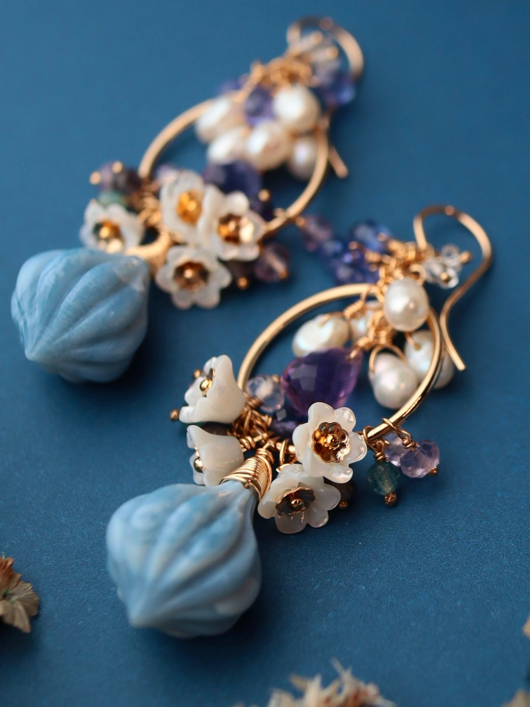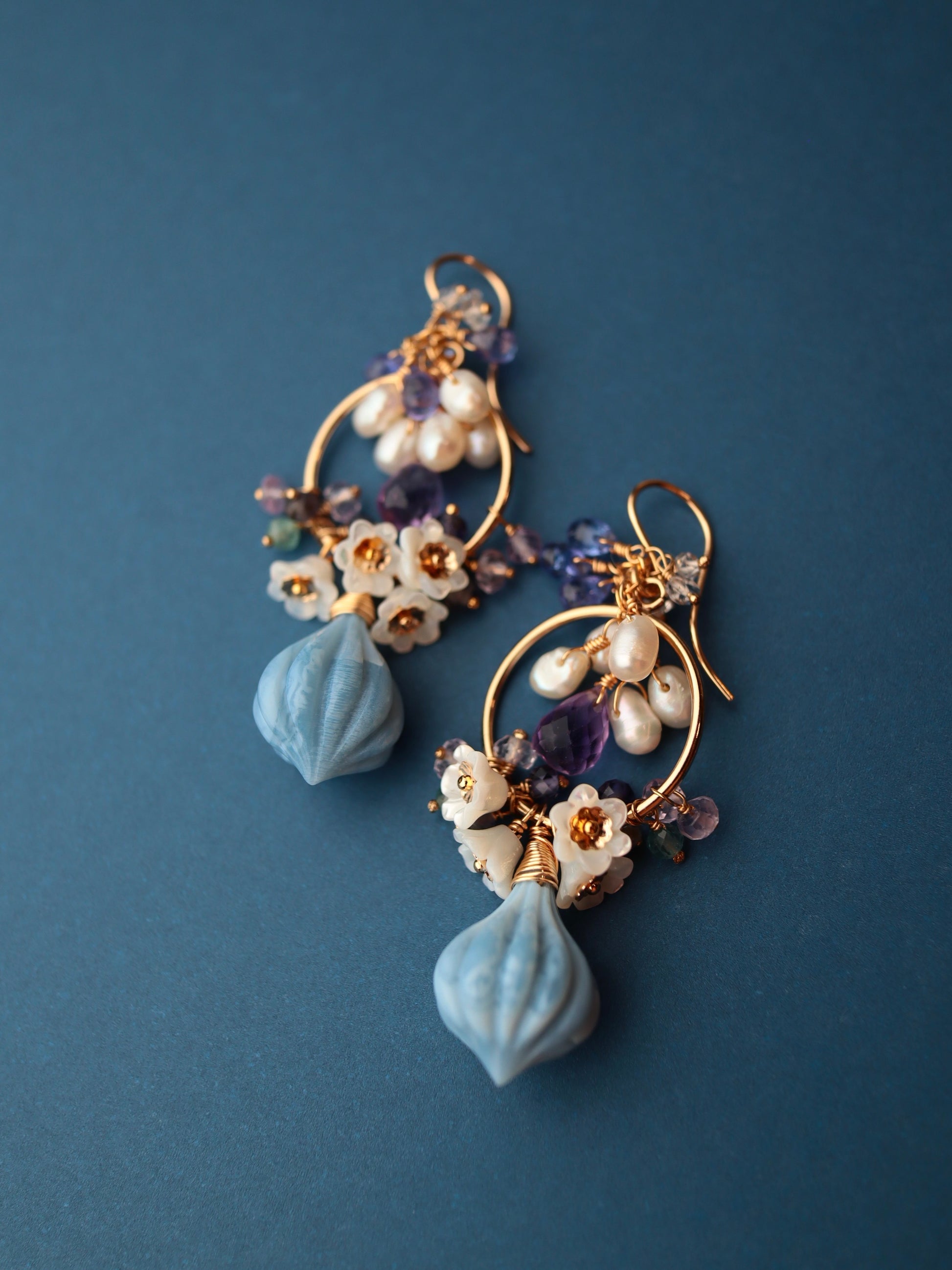 Blue opal, white shell, amethyst, tanzanite, double point quartz, iolite, green tourmaline